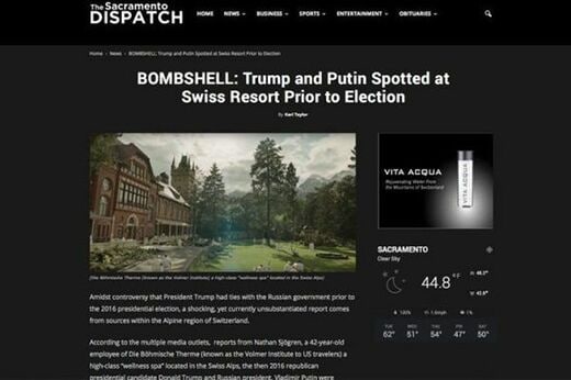 そしてそのサイトでは、「昨年の最終選挙戦でドナルド・トランプがスイスの片田舎にあるクリニックで、ロシアのウラジミール・プーチン大統領と密会した」という偽の記事を作成し、掲載していたのでした。