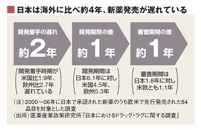 政府もドラッグラグの問題は認識しており、昨年7月、新薬の開発から承認までの期間を2年半短縮する方針を掲げた。政府は別の調査を基に、ドラッグラグは2年半ととらえており、これで欧米並みになると考えている。