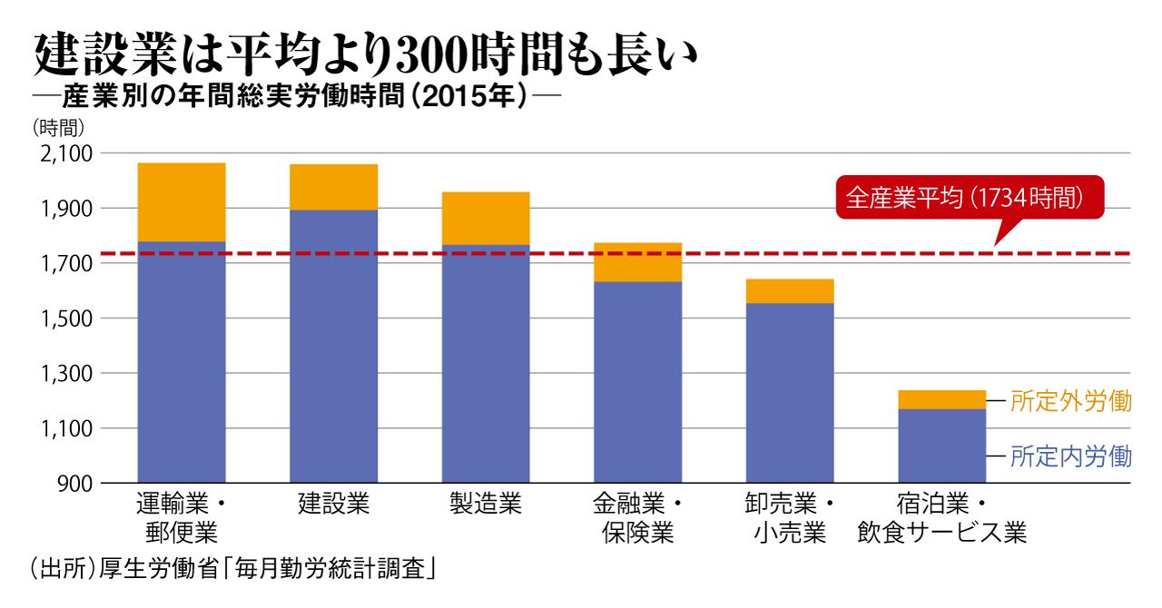 国内各地の建設工事現場は、今でも週休2日すら実現できていない。そのほとんどが土曜と祝日は稼働、休日は日曜だけというのが実態だ。実際、建設業の年間総実労働時間は全産業の平均より約300時間も長い(図表1)。ゼネコン35社の労働組合が加盟する日本建設産業職員労働組合協議会(日建協)の調査では、4週間当たり8日以上の休みを設定している工事はわずか5.7%。約6割の工事現場で4日以下だった。