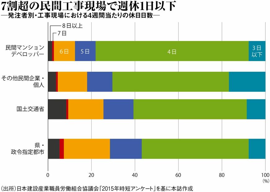 現場で週休2日を徹底するには、工期設定のあり方から見直す必要がある。官が発注する公共工事はともかく、デベロッパーなどが発注する民間工事は工期が厳しく、4週間当たりの休みは4日以下がほとんど(図表2)。とりわけ完成前に販売するマンションは、住民の入居日があるため遅延が許されず、現場へのプレッシャーが強い。地元との協議で着工が遅れたり、天候不順が続いたりすれば、本来なら休日の日曜でさえ稼働を余儀なくされることもある。