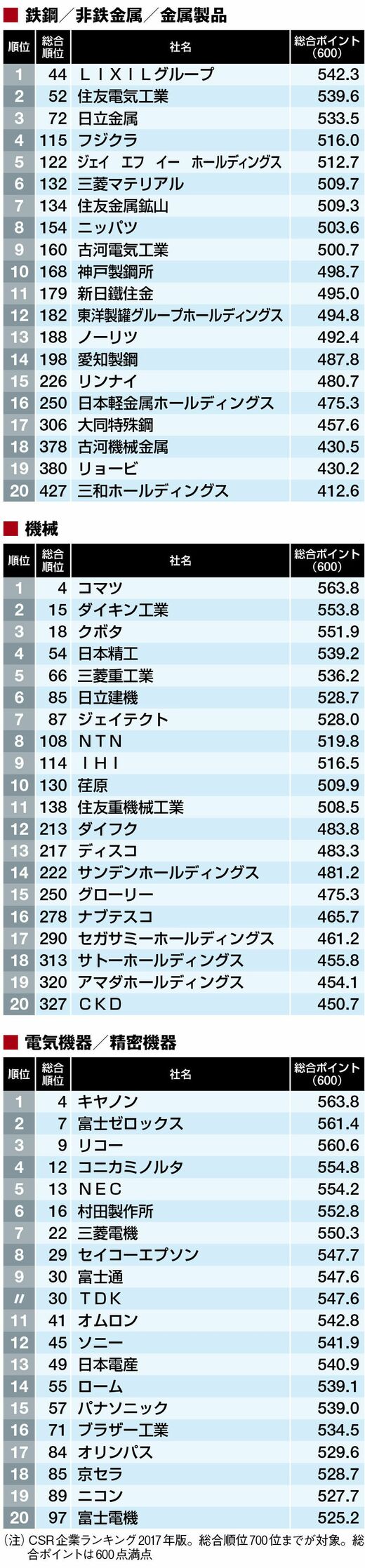 機械はコマツがトップ(563.8点)。人材活用93.0点、環境95.9 点、企業統治+社会性95.9点、財務279.0点と満遍なく得点。いずれも全体順位は20位台でベスト10以内はないが、総合力で総合4位となった。