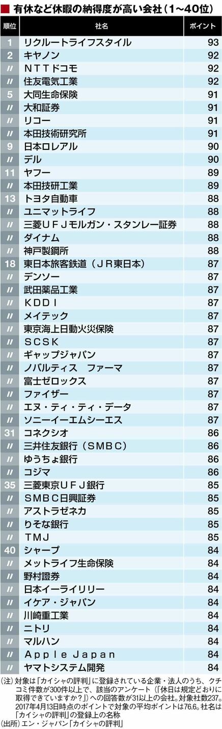 キャリア・教育 #就職四季報プラスワン 前の記事 次の記事 「休みが取りやすい」トップ100社ランキング 規定どおりに休日を取得できていますか? 4分で読める 公開日時:2017/04/22 06:00 宇都宮 徹 東洋経済 記者 フォロー 1/4 PAGES 2/4 PAGES 3/4 PAGES 次ページが続きます:【有休など休暇の納得度が高い会社50~92位】 4/4 PAGES
