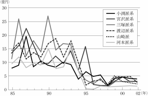 実際、各派閥の集金力は、1994年の政治改革を境に急激に減少した。1980年代後半には年間20億円を超えることもあった派閥の収入総額は、5億円を超えることがなくなった。もちろん、1991年のバブル崩壊後に平成不況が長期化したことや、1993年の自民党の下野なども、無視しえない要因として作用したはずである。ただ、政治資金制度改革を抜きにして、1990年代半ばの派閥の集金力の低下、その後の低迷を説明することはできない。