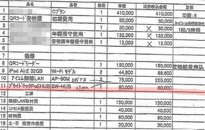 問題はこれだけではなかった。複数のパソコンを接続する中継装置、スイッチングハブも購入し、請求書には単価6万円と記されていた。ところが、納品された商品に記されていた品番をメーカーのウェブサイトで確認してみると、「希望小売価格4万9800円(税抜き)」と書かれていた。さらに、一般の販売サイトでは、最安値1万3303円で売られていたという。