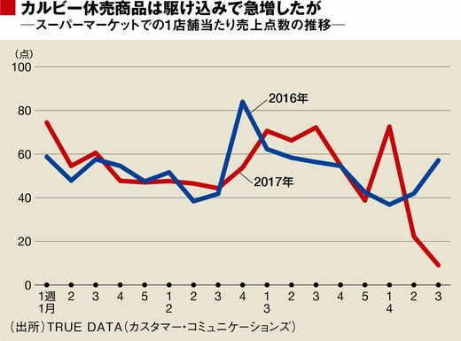 しかし、実際には2017年4月10日(月)から始まった1週間の売上点数は急増していた。2017年1~3月までは1店当たり週に50~60点ぐらいで推移していたのが、2017年4月10日(月)から始まった1週間は同93点になった。直前1週間は同44点。それまでの約2倍にハネ上がったことになる。