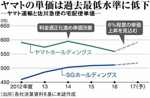 巨大な宅配網を抱えるヤマトは、佐川のようにたやすく宅配に見切りをつけることはできない。今年度は大改革を断行し、「時代に合わせて(体制を)設計し直す」(ヤマトHDの山内雅喜社長)。パートを含めた人員を9000人超増やす(2016年度は5202人増)ほか、宅配ロッカーを2018年3月までに3000カ所設置するなど受け取り方法を増やし、ドライバーの負担を減らす。
