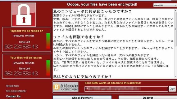 感染すると、その端末やネットワークで共有されたファイルは暗号化される。その解除と引き換えに、ハッカー集団は身代金300ドルをビットコインで要求する。欧州では病院や工場、鉄道の案内表示といったシステムへの感染が報道されている。