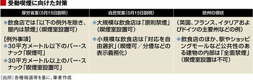 厚生労働省は5月15日、自民党内で開かれた厚生労働部会で、対応の強化を念頭に「飲食店内では原則禁煙」を目指す案を明らかにした。ところが自民党内では「飲食店での喫煙も例外で認める」とする意見が根強いことから、議論は真っ向から対立してしまった。