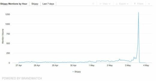 アモビー・ブランドインテリジェンス(Amobee Brand Intellicgence)によると、5月3日の全世界でのスキッピィ関連のデジタルコンテンツのエンゲージメントは、5月2日と比べて13.9倍だった。また、同期間のカナダ国内に限ると、実に254倍のエンゲージメントがあった。