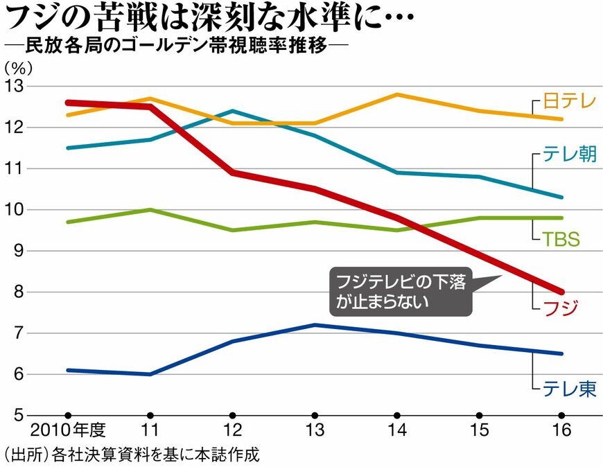 フジは2015年度にゴールデン帯(19〜22時)の視聴率でTBSテレビに抜かれ4位に転落。2016年度も低迷し、テレビ東京が背後に迫る。テレビ単体の営業利益は、すでに最下位だ。