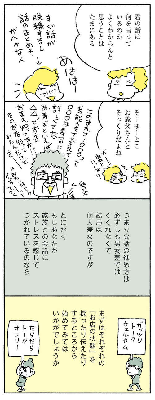 とはいえ、どんな家庭にも共通することとしてひとつ言えるのは、会話は家族の基本なので、その基本にストレスを感じていたら、長くいっしょに生きていくのはかなり厳しい!ということ。でも、ちょっとした工夫をしたり、そのストレスをうまく伝えることで解決する可能性もあるかもしれないのです。黙ってストレスを貯めたり、何もせずに家族であることをやめてしまうよりは、まずはその方法を探したり試したりしてみてもいいかもしれませんよ。