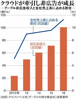 投資も徐々に実を結び始めている。クラウド事業を含む非広告収入はここ数年で急伸。2016年には初めてグーグル全社売上高の1割を超えた。