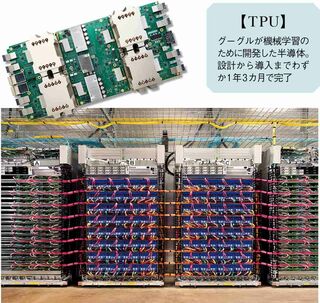 多くの人がグーグルのAIを活用すればデータセンターへの負荷は大きくなるため、処理能力を高めることが必須だ。グーグルは高速で消費電力の低いAI用半導体、「TPU(テンサー・プロセッシング・ユニット)」を独自に開発した。