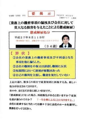 この罪状ペーパーは有村氏の顔写真付きで、社内報にも掲載。「皆さんもお気をつけください」と題した文書も全社員の自宅に送付した。文書は、クビになったら再就職もままらない世の中なので、家族を養っていくつもりなら反抗的な態度をとるべきではないとするものだった。