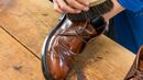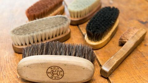 靴磨きで最初に行うのが、ホコリ払い。そのときに使うのが、柔らかく毛足の長い馬毛のブラシだ。またワックスをシワが入った部分にまでしっかり入れるためには、堅い豚毛のブラシも使う。おもに明石さんが使うのは、丁寧な手仕事で作られる日本橋の老舗「江戸屋」のもの。シンプルで使いやすいのだとか。