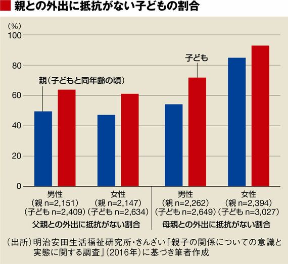 これを親世代が子どもの頃の結果と比較すると、子どもは男女とも父母いずれに対しても抵抗がない割合が高くなっています。今どきの若者は、親世代が子どもの頃以上に親と2人で外出することに抵抗が少なくなってきているということがいえそうです。特に母親との外出に抵抗がない男性は、子どもが71.8%であり、親の54.2%より17.6ポイント高くなっています。母と娘のみならず、母親と息子の距離感も大幅に近くなってきていることがうかがえます。