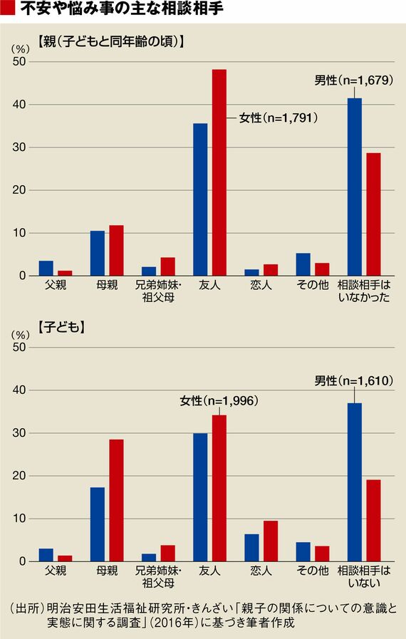 加えて、不満や悩み事があるときの相談相手についても見てみましょう。親(子どもと同年齢の頃を思いして回答)と子どもに不満や悩み事の主な相談相手を尋ねたところ、男性は「相談相手はいなかった(いない)」が親41.5%・子ども37.0%、女性は「友人」が親48.2%・子ども34.2%と、それぞれ最も高くなっています。