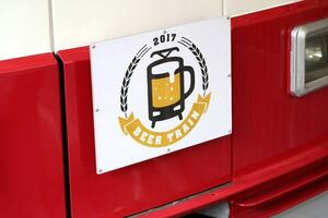 運行日の6月10日の昼、運よくチケットをゲットした参加者たちが出発駅である京急川崎駅にやってきた。「キリン一番搾り」ののぼり旗があちこちに飾られたホーム上に4両編成の列車が停車している。車両前面には電車とビールジョッキを合体させたようなデザインのヘッドマークが取り付けられている。