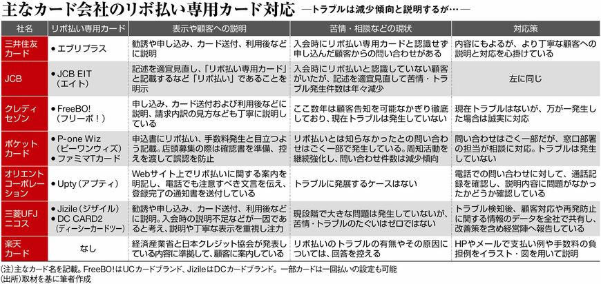 中には、「店頭募集の際はリボ払いであること、手数料の発生について確認書を作り説明したうえで、確認事項のチェックと本人の自署をもらい、顧客控えを持ち帰ってもらうことで誤認を防止している」(ポケットカード)という会社もある。