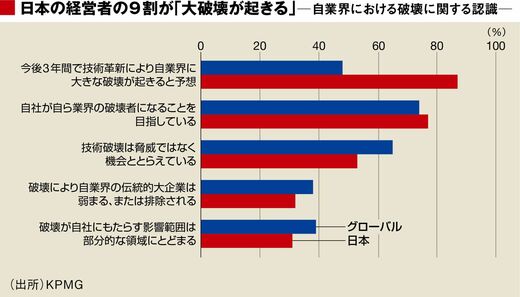 日本からは売上高100億ドル以上の大企業を中心に100人のCEOが回答しているが、「自業界における破壊に関する認識」について87%が「今後3年間で技術革新により自業界に大きな破壊が起きると予想」している。これはグローバル調査の48%を大きく上回っている。同じ質問に対し、「技術破壊は脅威ではなく機会ととらえている」という回答が53%あったが、逆の見方をすると、相当な割合のCEOが「今後3年で技術破壊が起き、自業界にとって脅威になる」と考えていることになる。