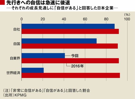 「自国の成長見通し」に自信を持っている日本企業のCEO(最高経営責任者)は昨年の91%に対して今年は71%、「自業界の成長見通し」に自信を持つのは昨年の92%から今年は41%と大幅に後退――。