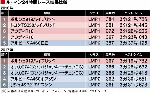 ひとつはLMP2マシンの性能向上だ。ル・マンは24時間に何周したかで順位が決まる。昨年と今年の上位入賞マシンの周回数を見ると、いくつか気づく点がある。