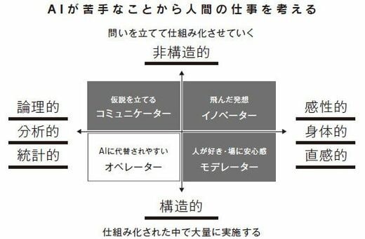 では、「人間にしかできない仕事」「AIのほうが得意な仕事」とはなにか。整理して考えてみたいと思います。