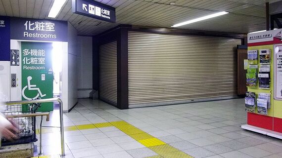 新木場駅、JR京葉線ホーム直下にあった、湾岸そば新木場店。混雑する時間帯は、カウンターだけでは客があふれてしまうため、店舗向かいのホーム連絡エレベーターの横に、簡易テーブルを出して、湯気をゆらしていた店です。現在は、そのテーブルも片付けられ、シャッターを閉めて次の工事を待っています。