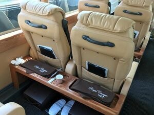 天井の荷物棚を取り外し、座席前にムクの木でできた手荷物置きを作ったり、トランクには荷物専用のロッカーや冷蔵庫を備えるなど、豪華な作りをウリにしている。