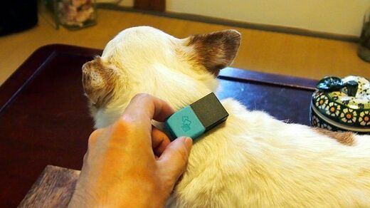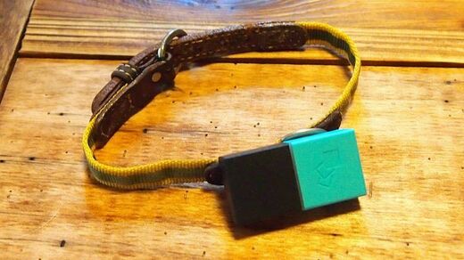 とすれば残る選択肢はひとつ。イヌちゃんの首輪に「動きタグ」を貼り付けるしかない。とはいえ、首輪に直接貼り付けてしまったら、「動きタグ」を他に利用することができなくなるし、消しゴムサイズとはいえプラスチックの塊が直接お肌に触れるのは。イヌちゃんにとっても不快なことだろう。