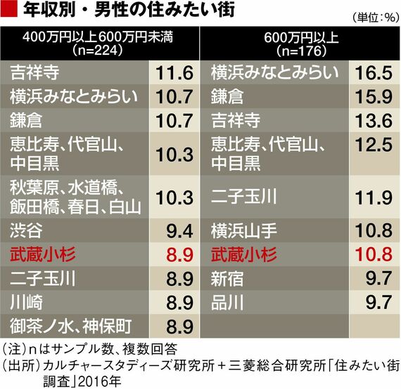 まず男性の年収別で見てみると、年収が高いほど武蔵小杉の人気が高く、600万円以上では10.8%で6位だった。