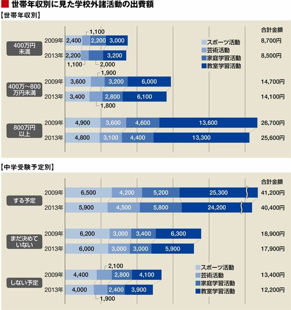 まず3種類の年収別(すなわち400万円未満、400万~800万円未満、800万円以上)に、教室学習活動費はそれぞれが1カ月に3200円、6100円、1万3300円であり、年収が高くなるにつれて2倍、4倍と増加している(2013年)。年収の高い家庭ほど高い支出をしているので、塾に通っている確率は高いし、複数の科目を塾で受講している可能性が高い。