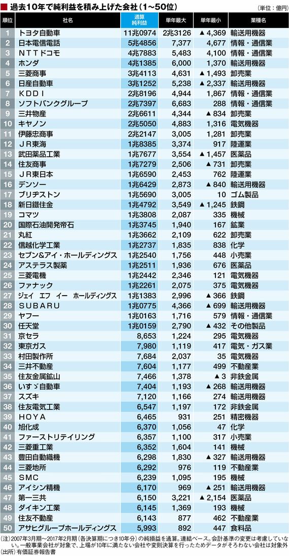 政治・経済・投資 過去10年で純利益を積み上げたトップ500社 不動の1位トヨタは11兆円超、優良企業が圧倒 4分で読める 公開日時:2017/07/11 16:20 田中 久貴 東洋経済データ事業局 フォロー 1/11 PAGES 2/11 PAGES 次ページが続きます:【51~100位は?】 3/11 PAGES 4/11 PAGES 5/11 PAGES 6/11 PAGES 7/11 PAGES 8/11 PAGES 9/11 PAGES 10/11 PAGES 11/11 PAGES