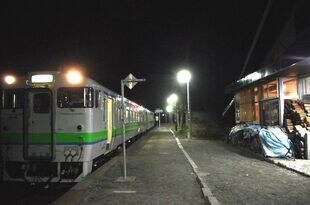 お話を聞いた後、外を見ると暗闇の中を長万部方面最終列車のキハ40がやってくるのが見えた。中には学生がチラホラと乗っている。