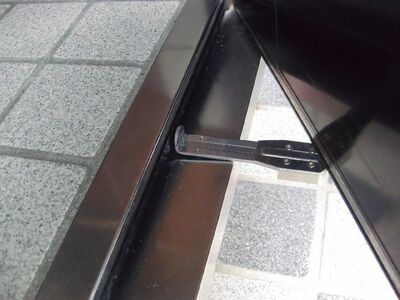 同社オリジナルの繋止錠。外出をする際に、先端のフックを玄関扉に引っ掛けるだけで施錠できます。
