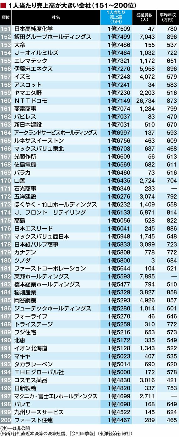 政治・経済・投資 「1人当たり売上高」トップ500社ランキング 1位は14億円超、卸売り系が上位に目立つ 3分で読める 公開日時:2017/07/19 05:00 東洋経済オンライン編集部 フォロー 1/11 PAGES 2/11 PAGES 3/11 PAGES 4/11 PAGES 5/11 PAGES 次ページが続きます:【201~250位は?】 6/11 PAGES 7/11 PAGES 8/11 PAGES 9/11 PAGES 10/11 PAGES 11/11 PAGES