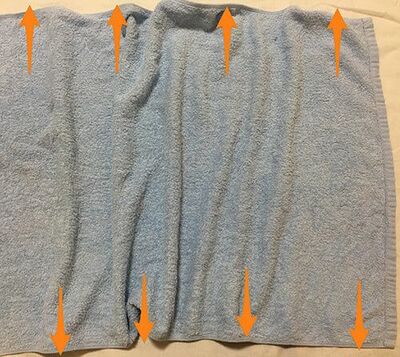 縦に伸ばしてみましょう。縦の上下相互方向に進展させ、かつ、方向の厚み幅もつける(この絵図の場合、矢印1個だけでなく、この場合4個。)ことで、縦のしわのみが残りました。でも、一本の相互方向のみ伸ばしても、しわ自体は、解消しません。