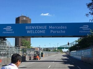 レースの前日、コースを歩くと、こんな横断幕がかかっていた。ポルシェとメルセデスの参戦は2019年開幕の第6シーズンからだが、ビッグネームの参戦を主催者は大いに歓迎している。すでに参戦を表明したアウディ、BMW を含め、これでドイツの4大ブランドがフォーミュラEにそろい踏みする。