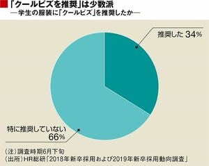 今年の6月下旬にHR総研が行った「2018年新卒採用および2019年新卒採用動向調査」では、「学生にクールビズを推奨」とする企業は企業の3分の1にとどまる。推奨の理由としてもっとも多いのは、「会社がクールビズを採用しているから」というものだ。
