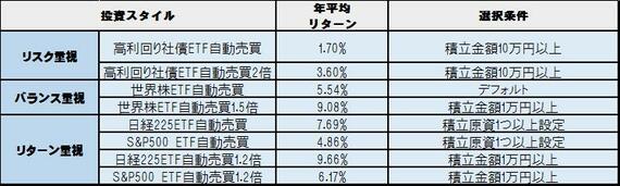 マネーハッチの口座開設後、投資スタイルを選択することができる。選択肢は3つで、「リスク重視」「バランス重視」「リターン重視」の3タイプだ。さらにそれぞれのタイプ別に複数のコースが用意されており、開始当初では全8コース(条件によっては選択できないコースもある)。なお、口座開設当初は「バランス重視」の、世界株の8割に投資するコースが選択されている(2017年8月2日現在)。