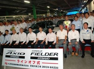 ラインオフ式とは、最初の量産車が生産工程を経て完成したことを祝う式典。国内向けカローラを全量生産する宮城大衡工場で、4ドアセダンの「カローラアクシオ HYBRID」とワゴンタイプの「カローラフィールダー HYBRID」の生産が、本格的に立ち上がったことを意味する。同工場でHVをつくるのは、今回が初めてとなる。