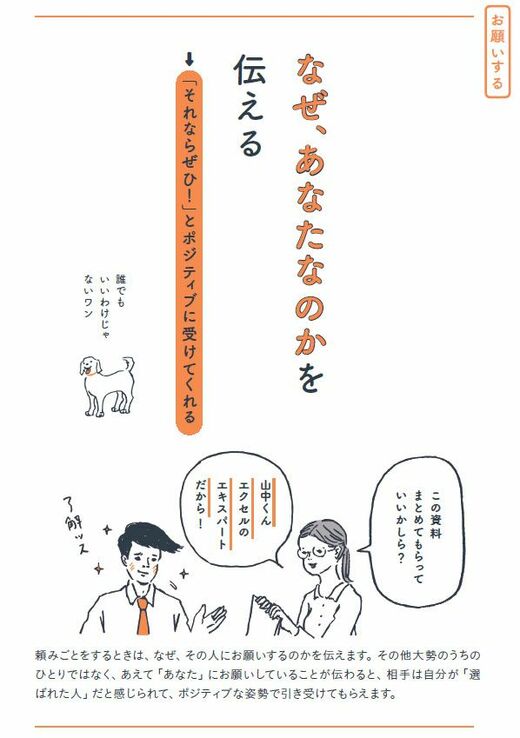 また、「◯◯さんは、エクセルが得意だから」など、なぜその人にお願いするのか、理由を伝えるのもおすすめです。その他大勢のうちのひとりではなく、あえて「特定の人」にお願いしていることが伝わると、相手は「自分は選ばれた人」だと感じられて、ポジティブな姿勢で引き受けてもらえます。
