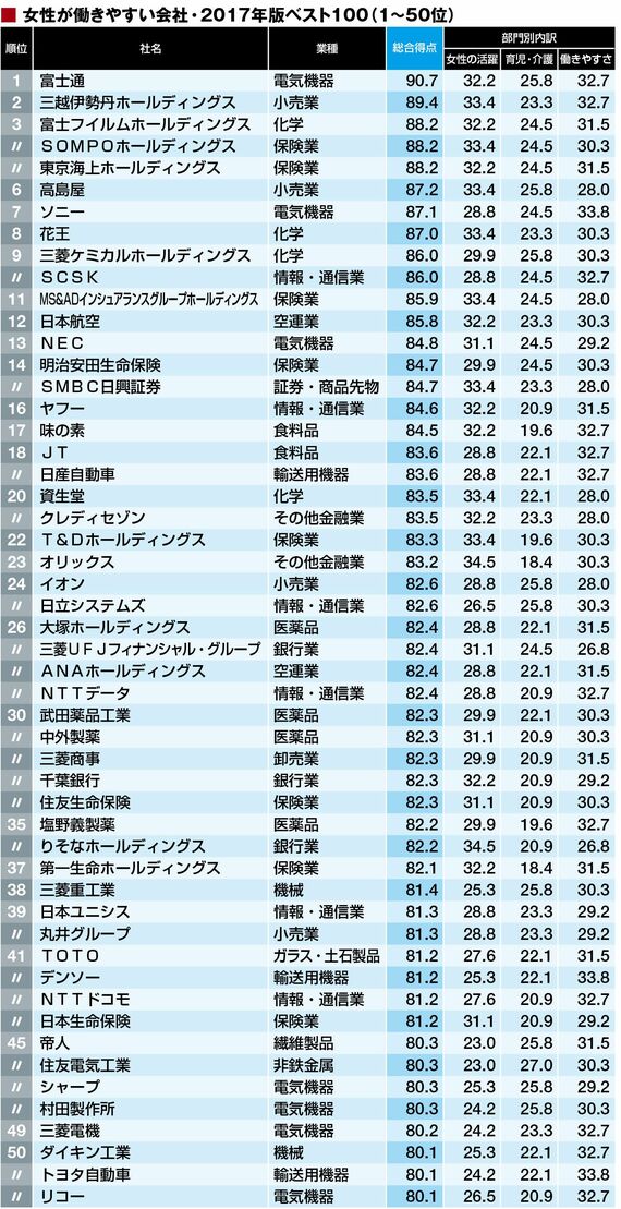 ビジネス #CSR企業総覧 前の記事 次の記事 最新!「女性が働きやすい会社」ベスト100 活躍度と育児・介護への対応などを総合評価 6分で読める 公開日時:2017/08/27 06:00 岸本 吉浩 東洋経済 記者 フォロー 1/4 PAGES 2/4 PAGES 3/4 PAGES 次ページが続きます:【続いて51~100位】 4/4 PAGES