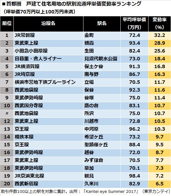 続いて、坪単価70万円以上100万円未満について見ていく。都心へのアクセスがよい駅で上昇が顕著だが、そうではない駅もランクインした。