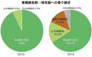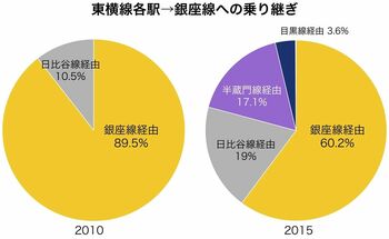 「乗り換えの面倒さ」を理由にルートが変わったと思われる例はほかにもある。たとえば銀座線への乗り継ぎルートは、2010年には89.5%が渋谷で直接乗り換え、残りの10.5%が日比谷線経由だったが、2015年には渋谷でまず半蔵門線に乗り換え、表参道で銀座線に乗り換えるというパターンが17.1%出現。渋谷で銀座線に直接乗り換える割合は60.2%に低下している。