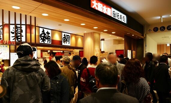 大起水産は、関西中心に回転寿司、水産物小売店を幅広く展開する魚屋さんです。お昼時になるといつも、大起水産のお店の前に行列ができるのを見て、不思議に思うことがありました。こちらの寿司の価格帯は、100円から500円まで。銀座や北新地の高級寿司店に比べたらもちろん安いですが、一方で百円寿司のお店よりは高めの価格設定です。