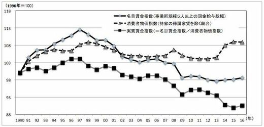 図1は、1990年を100 とした日本の名目賃金指数、消費者物価指数、実質賃金指数(=名目賃金指数/消費者物価指数)である。1990年代の日本経済では、バブルの崩壊による景気悪化によって、失業率の一貫した上昇が生じた。にもかかわらず、日本の実質賃金は、1997年頃まで高い率で上昇し続けた。それは、不況によってインフレ率が低下する中でも、名目賃金の上昇率がそれほど低下しなかったからである。