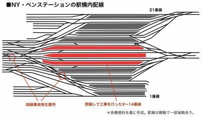 特にPRR時代に西のハドソン川底トンネルと、東のイーストリバー川底トンネルに直結する形で最初に建設された9番線から14番線については、1970年代に保線を行った後、現在に至る40年間、本格的な保線や検査が行われていないという疑いが出てきたのである。この6線はアムトラックとNJT(6線とも)LIRR(13番線と14番線のみ)が共用しており、保線管理の責任をアムトラックが負っている。