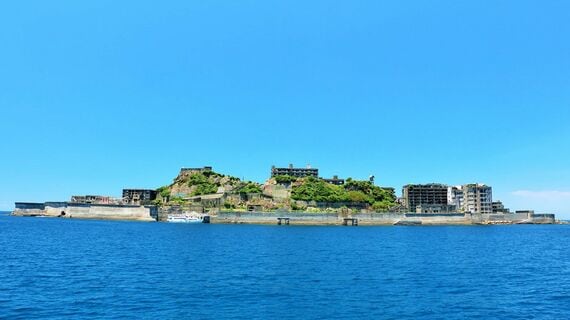 8月18日、軍艦島の愛称で知られる長崎県の端島炭坑を団体客が訪れた。記念撮影に収まる彼らの手には、こんなメッセージボードがあった。
