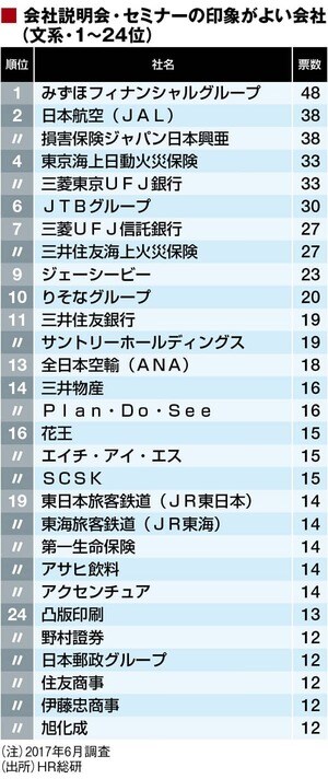 まず演出のうまさが目立つのがみずほだ。「職種ごとにブースが分かれており、テーマパークを回っているようでワクワクしたから」(京都産業大学、文系)、「かなり大規模な座談会という感じで、業務の幅が広いぶん迫力があった」(東北大学、文系)、「採用におカネをかけていて、空間がハイカラ。そしてみずほの人と話せることが魅力」(学習院大学、文系)、「派手だった」(東京工業大学、理系)と評判がいい。